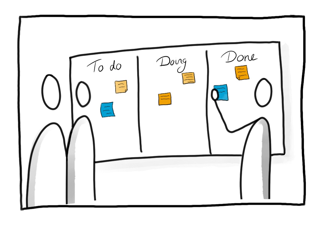 Eine besonders bewährte Methode ist das Task Board (Scrum / Kanban Board). Es hilft dem Team, den geplanten Sprint Backlog visuell darzustellen und die Aufgaben nach Priorität zu ordnen. Ein Task Board kann physisch oder digital genutzt werden und besteht häufig aus den Spalten „To Do“, „In Progress“ und „Done“. Müssen Aufgaben kategorisiert werden, können Swimlanes ganze Aufgabenbereiche unterteilen oder Farben und Symbole einzelne Aufgaben visuell hervorheben.