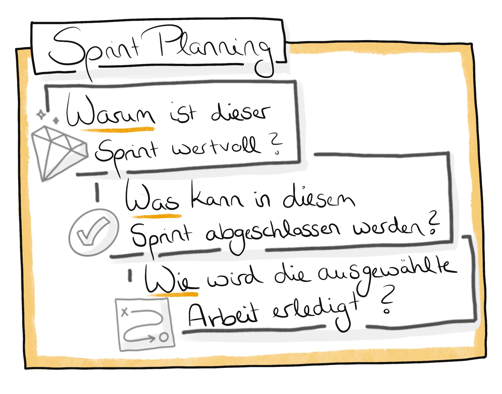 Zu Beginn steht immer die Frage: Welchen Wert wollen wir in diesem Sprint schaffen? Erst wenn das Sprintziel klar formuliert ist, lohnt es sich, passenden Backlog-Items auszuwählen und deren Umsetzung zu planen. Eine visuelle Leitlinie, etwa in Form einer Agenda oder einer einfachen Skizze des Ablaufs, unterstützt dabei, sich zuerst auf den Wert zu konzentrieren, den das Team in diesem Sprint schaffen möchte.