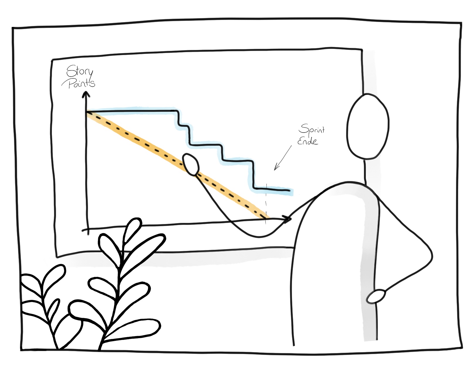 Ein Burndown-Chart zeigt, wie sich der Arbeitsfortschritt im Sprint entwickelt und macht auf einen Blick sichtbar, ob das Team auf Kurs ist oder sich Engpässe abzeichnen. Idealerweise fällt die Kurve kontinuierlich. Stagniert sie hingegen, kann das ein Hinweis auf Blockaden oder unerwartete Probleme sein. Letztlich kann Visualisierung dem Team helfen, ihre Arbeitsweise anzupassen und gezielt Maßnahmen zu ergreifen, um den Sprint erfolgreich abzuschließen.
