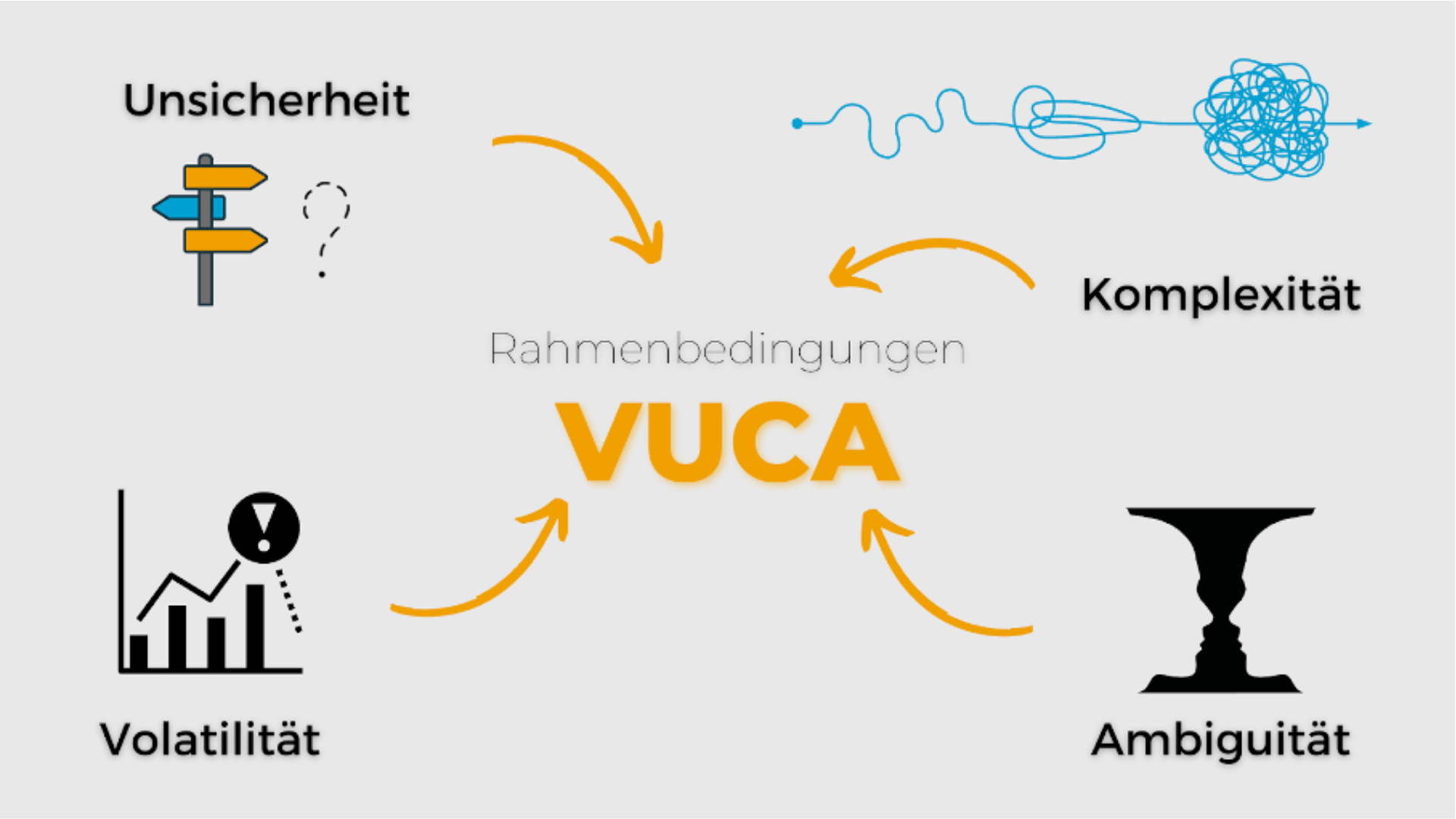 VUCA ist ein Akronym für die Worte Volatilität, Unsicherheit, Komplexität (Complexity) & Ambiguität. Es ist ein Versuch, das immer komplexer werdende Marktumfeld, in dem Unternehmen heutzutage agieren müssen, zu beschreiben. Klassische Strategien des Industriezeitalters greifen nicht mehr. Einzelpersonen, Teams und Unternehmen müssen immer häufiger Lösungen zu Problemen finden, die nie zuvor dagewesen sind oder sogar Probleme, die wegen ihrer Komplexität noch gar nicht in Gänze bekannt sind.